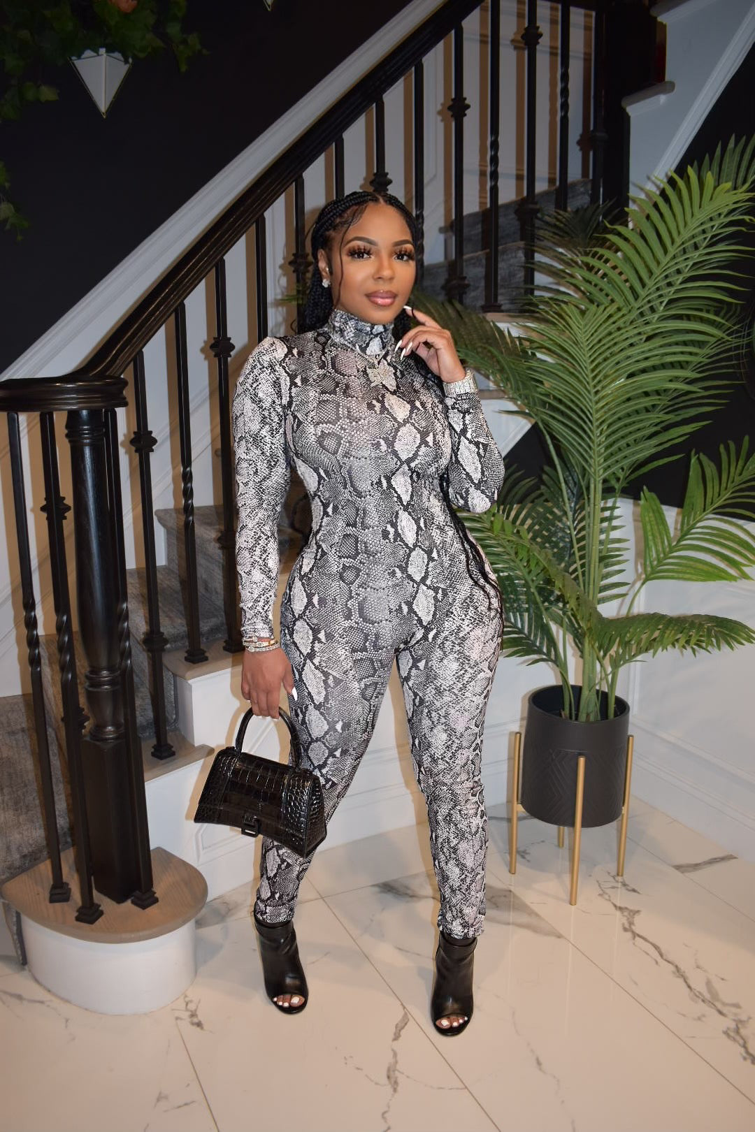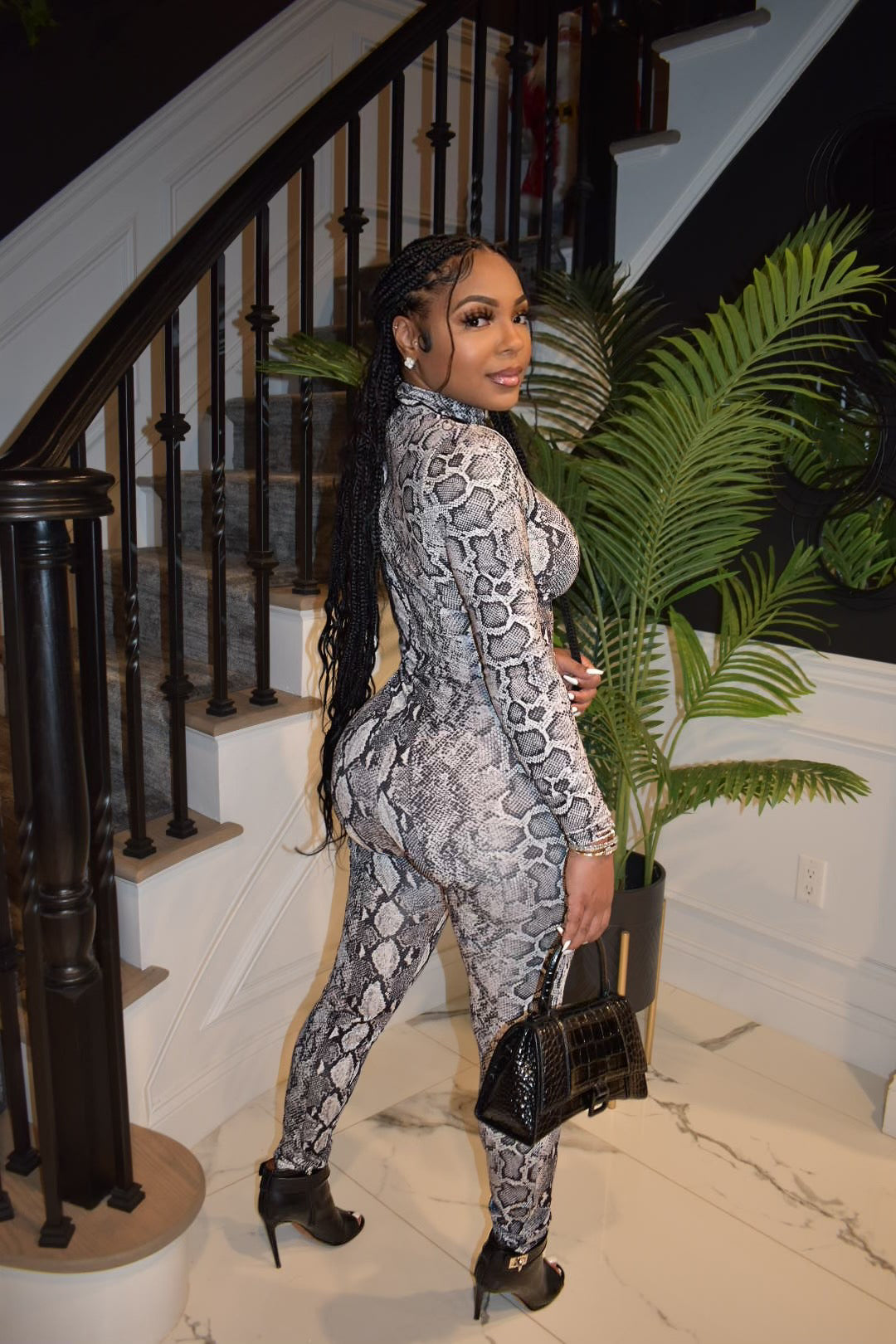 Sexy, snake print, one piece jumpsuit. Has stretch. Model is wearing size small and weighs 140 pounds.