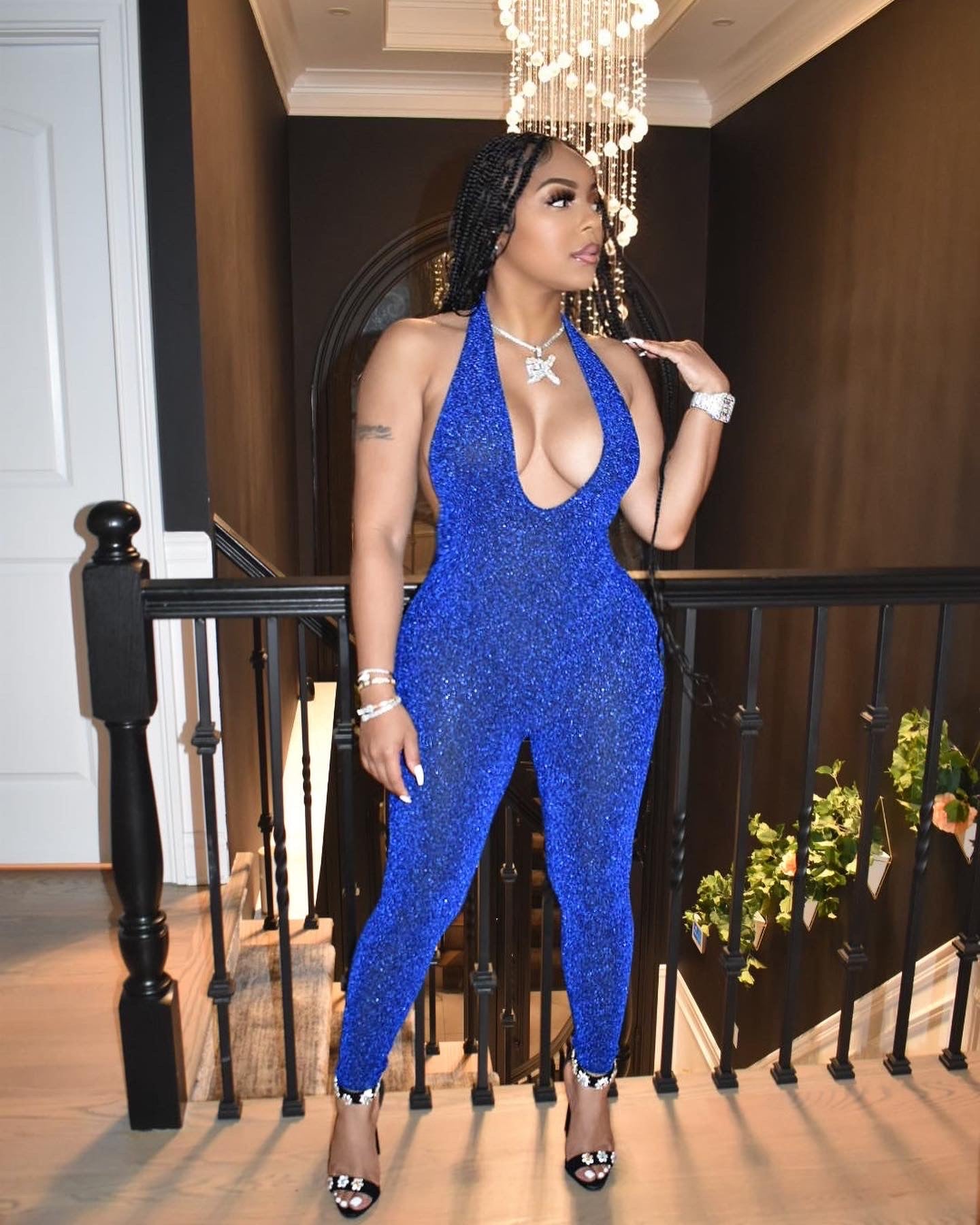 Sparkly, sexy, halter top jumpsuit. True to size. Has stretch. model is wearing size small.