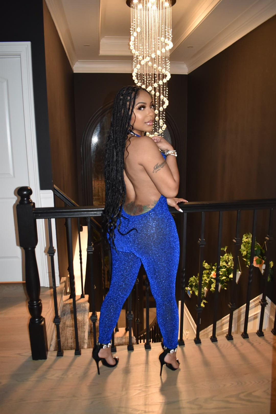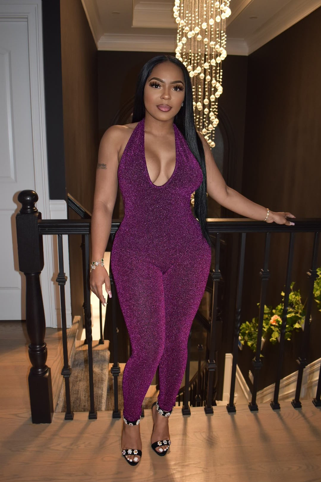 Sparkly, sexy, halter top jumpsuit. True to size. Has stretch. model is wearing size small.
