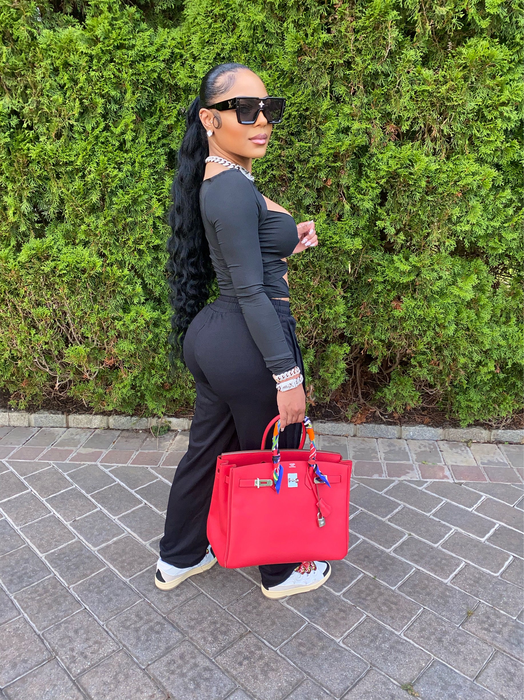 Pleated, loose, stretchy sweatpants.